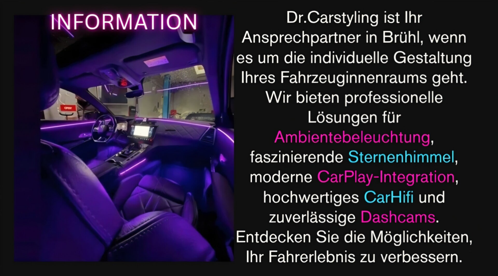 Ihrem Spezialisten für Ambientebeleuchtung, Sternenhimmel, CarPlay, CarHifi und Dashcams.